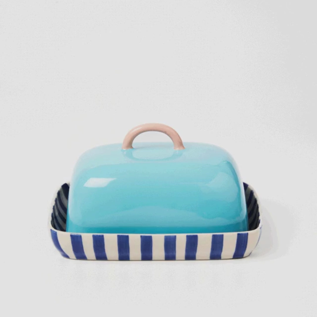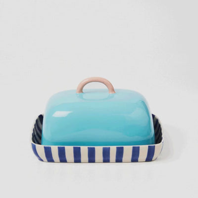 Brighten up your bench top. This blue ceramic butter dish is hand-painted with our Bloomie stripes and finished with a glossy glaze and a blush pink handle. Made from earthenware clay, it's ideal for keeping butter cool and accessible, whether you're hosting brunch or just making toast feel special.