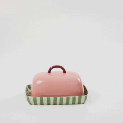 Sweet and satisfying, this pink ceramic butter dish is all about joyful detail, like the soft green striped base, hand-formed handle, and warm blush lid. Made from durable earthenware and painted by hand, it's a pretty way to keep butter out on the counter (and get compliments while you do it).