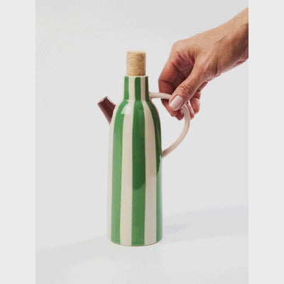 This striped green oil pourer is made for olive oil, vinaigrettes or dressing your table with something a little special. Handcrafted from earthenware and finished with a snug cork stopper. Sitting next to the stove, it's a chic addition to the kitchen which is highly functional.