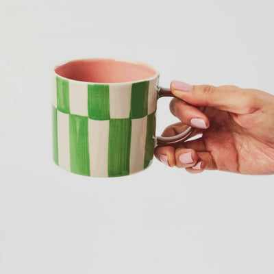 Bring some playful pattern to your coffee ritual. The Bloomie Green Check Mug is hand-painted in a graphic gingham style check, with a smooth pink glaze inside for contrast. It's the kind of mug that makes coffee breaks feel like a treat, fresh, functional, cool and beautifully crafted from earthenware.